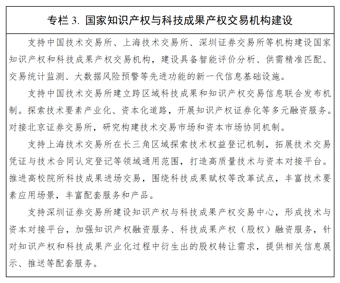 1. 建立全國統一(yī)互聯互通的技術交易網絡。支持中國技術交易所、上(shàng)海技術交易所、深圳證券交易所建設國家知識産權和科技成果産權交易機構,在全國範圍内開展知識産權轉讓、許可等運營服務。支持國家知識産權和科技成果産權交易機構鏈接各區域或行業技術交易機構,統一(yī)規則,破除信息“孤島”和碎片式運營,建設全國統一(yī)、互聯互通的技術交易市(shì)場。鼓勵各技術交易機構聯合資産評估、法律、拍賣、招标、咨詢、投資等各類專業服務機構,建立覆蓋産權界定、價值評估、流轉交易、擔保、誠信監督的綜合服務體系。鼓勵各類科技成果特别是财政資金(jīn)資助形成的科技成果進場交易。
